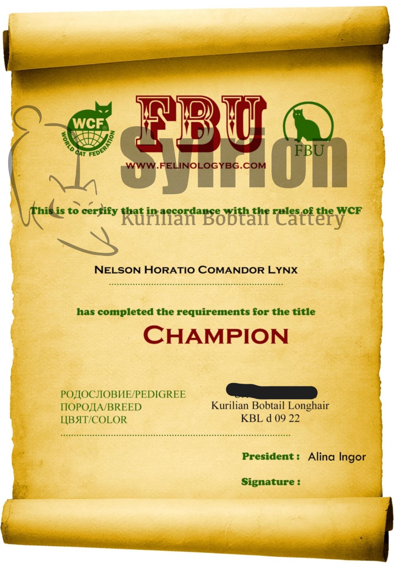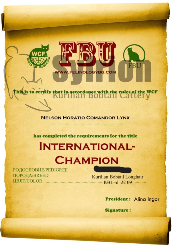 С гордост ви представяме Нелсън – истинско съкровище сред курилските бобтейли. Нелсън е плод на великолепни шампионски линии, като и двамата му родители са световни шампиони в системата на WCF.